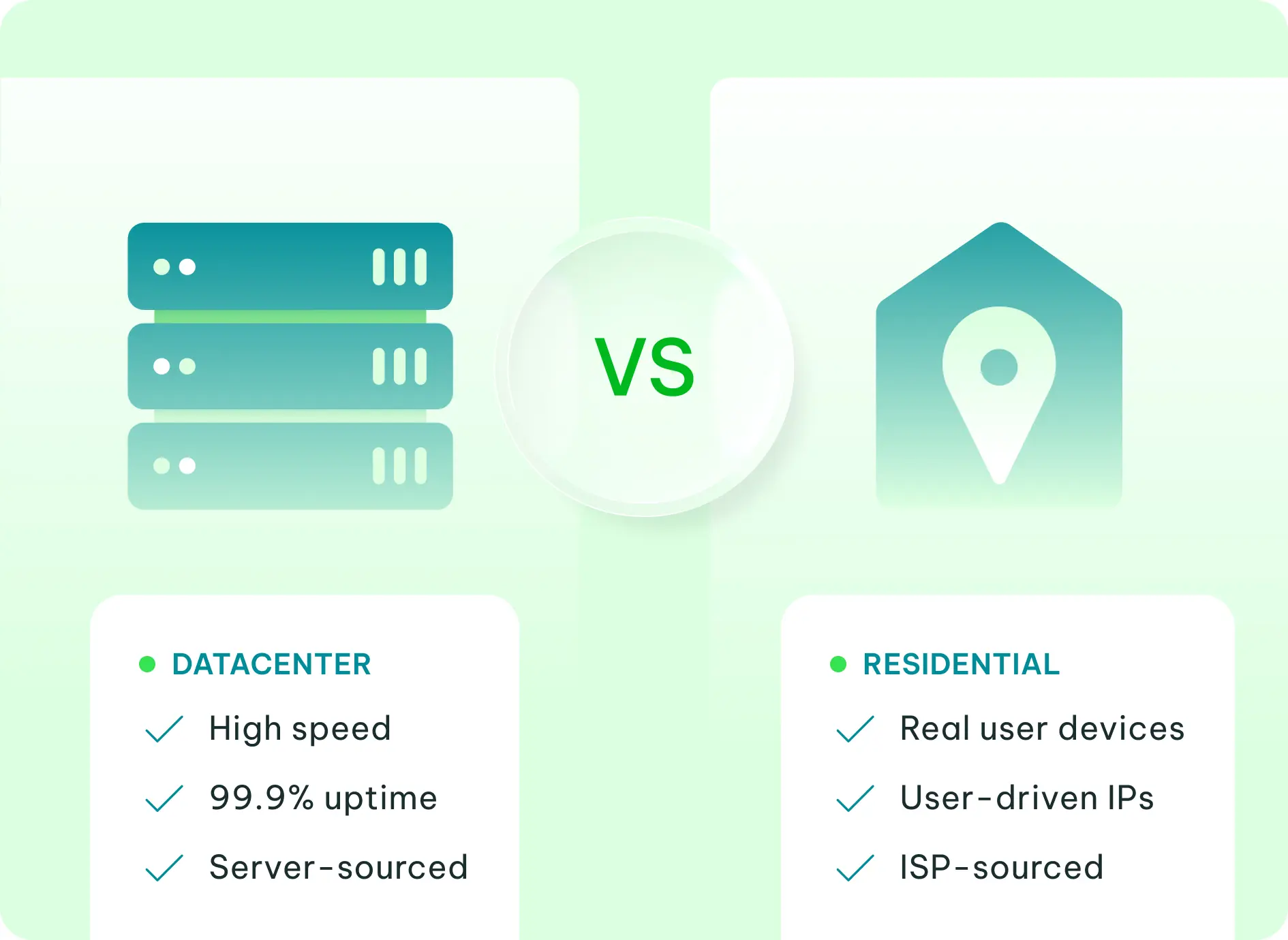 Datacenter proxies, like any other type, act as an intermediary between your computer and a destination server. Datacenter IPs are acquired from other businesses, which are running large clusters of servers. These servers are used to create many datacenter IP addresses at once while residential proxies get their IP directly from an internet service provider