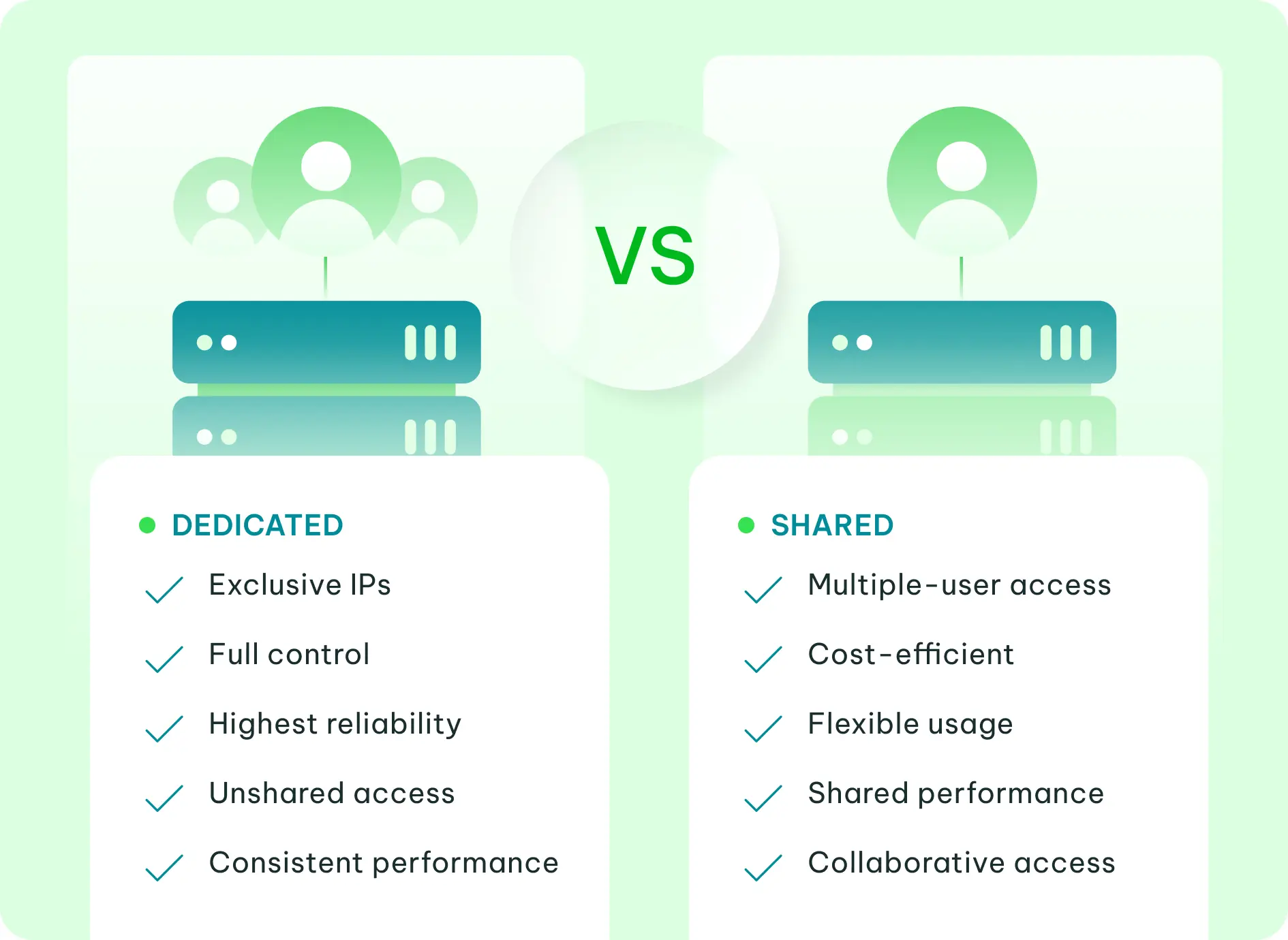 A dedicated (also known as private) proxy differs from a shared one only by virtue of how many users can use the same IP address at once. Dedicated proxies are granted to a single user while shared may have many users at once. They are also sometimes called private proxies as you can use the same IP address for a long time without other users making use of it.